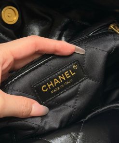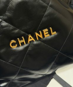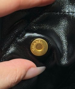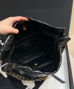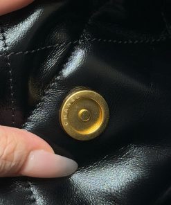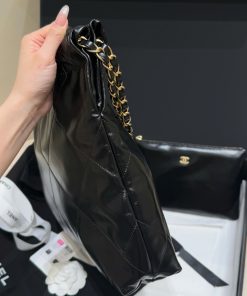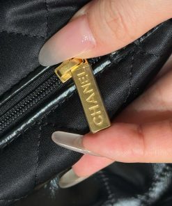 • Sản phẩm chính: Túi bucket đeo vai (kiểu dáng drawstring) bằng da đen bóng, thiết kế chần bông (quilted), logo CHANEL to bằng kim loại mạ vàng phía trước.