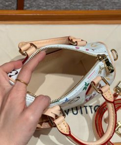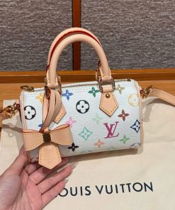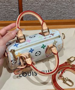 • Model: Louis Vuitton Speedy 25 (or Nano/BB depending on size) in Multicolore White. This is a miniature Speedy Boston Bag, with double handles and a detachable crossbody strap.