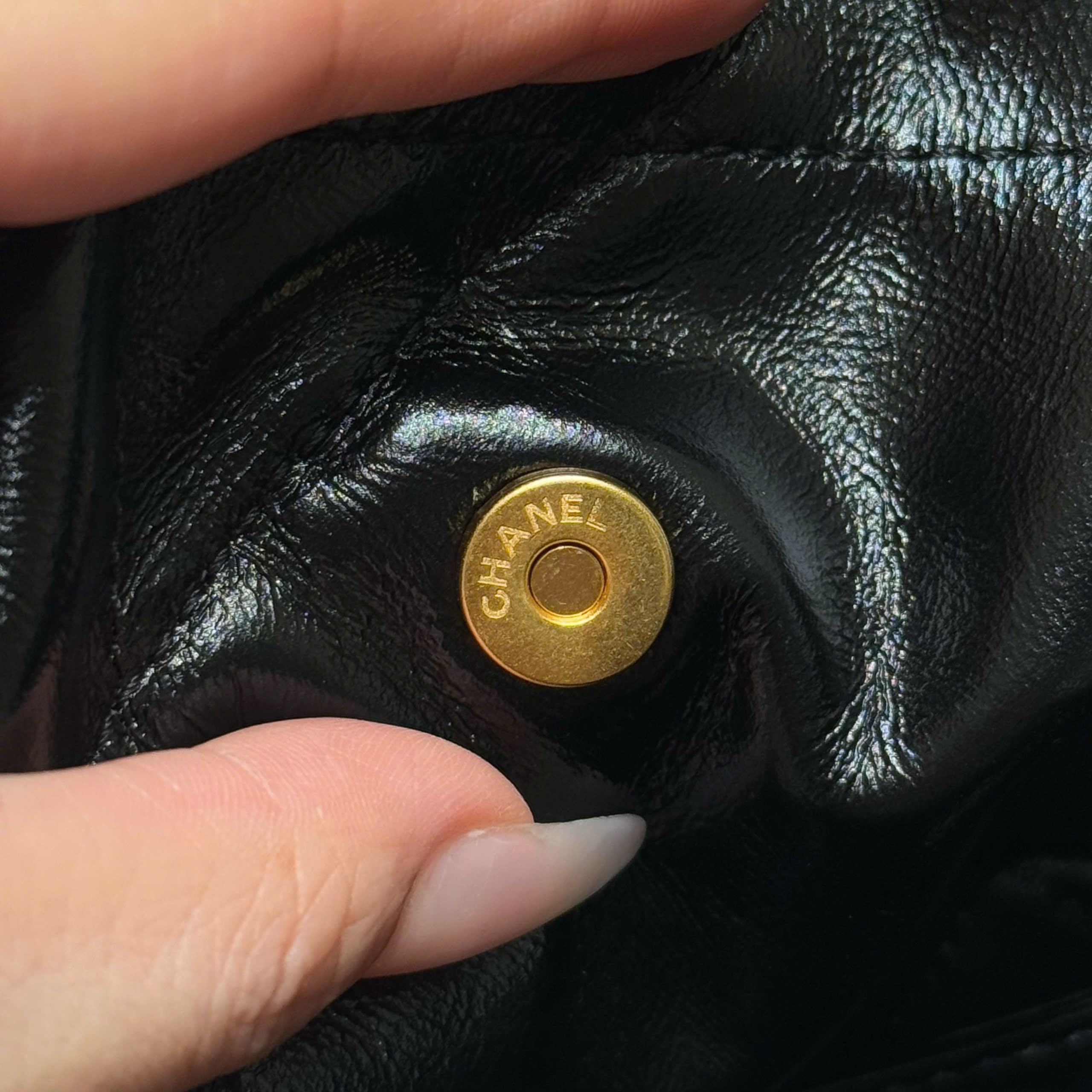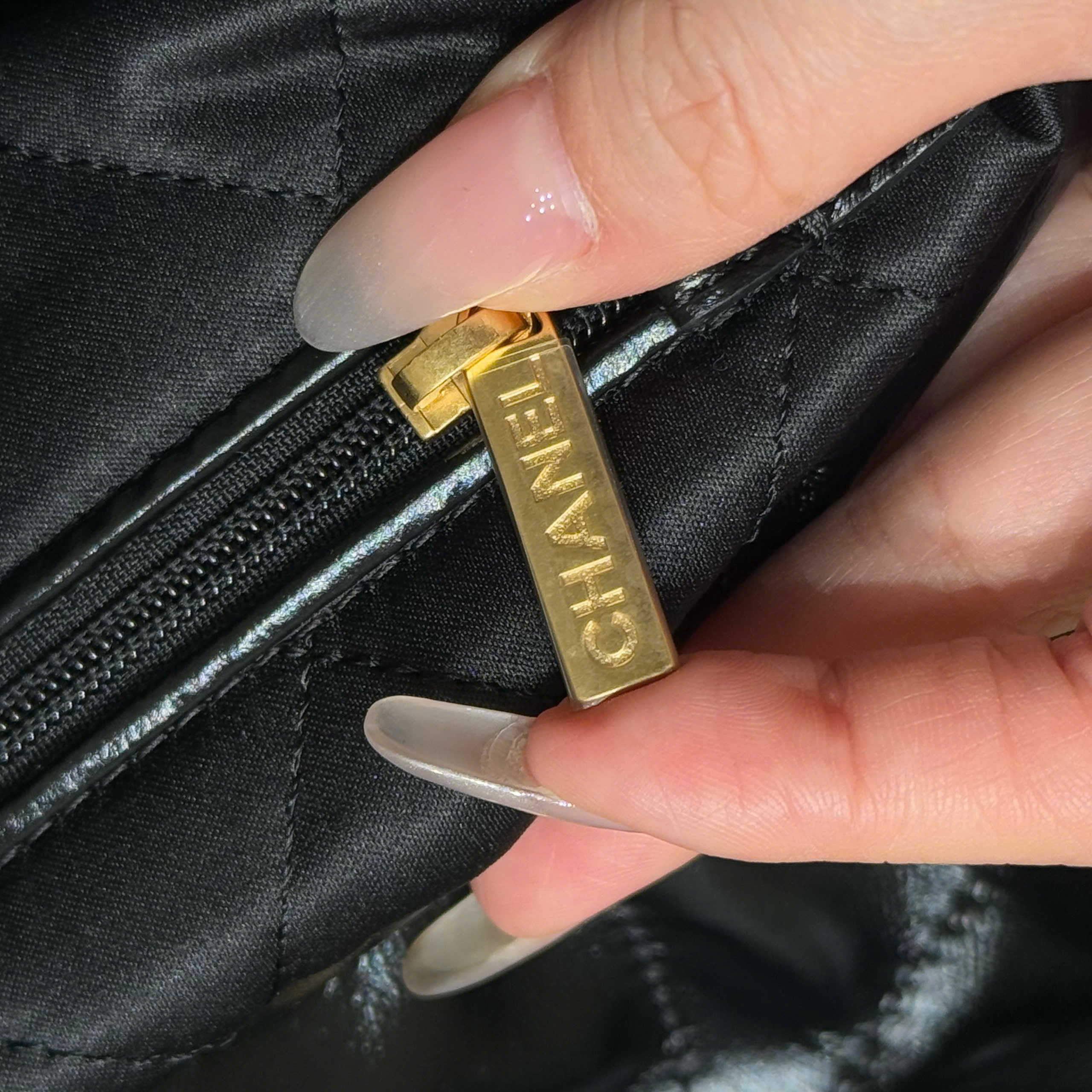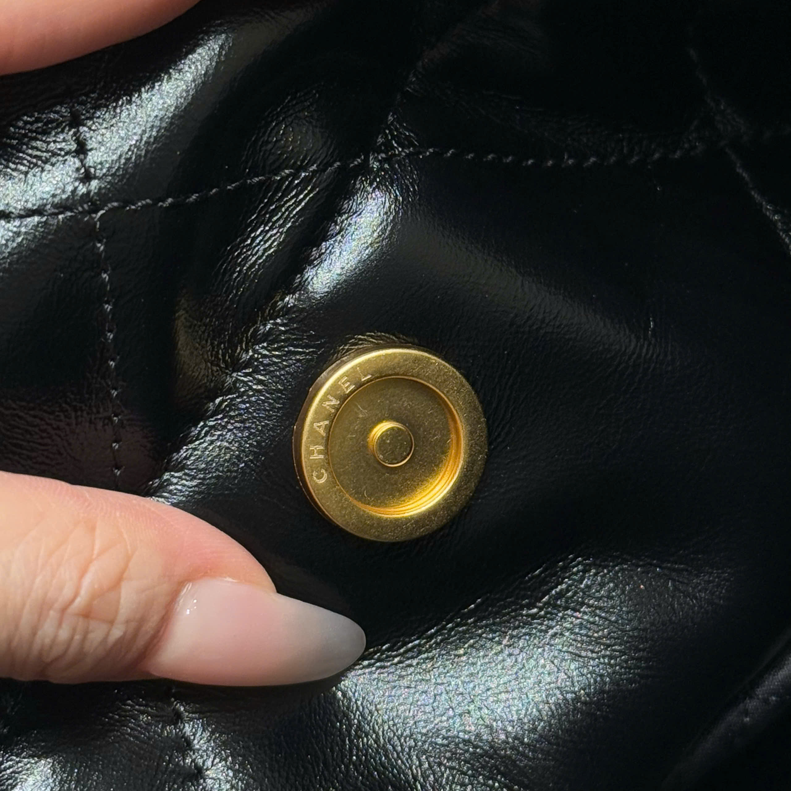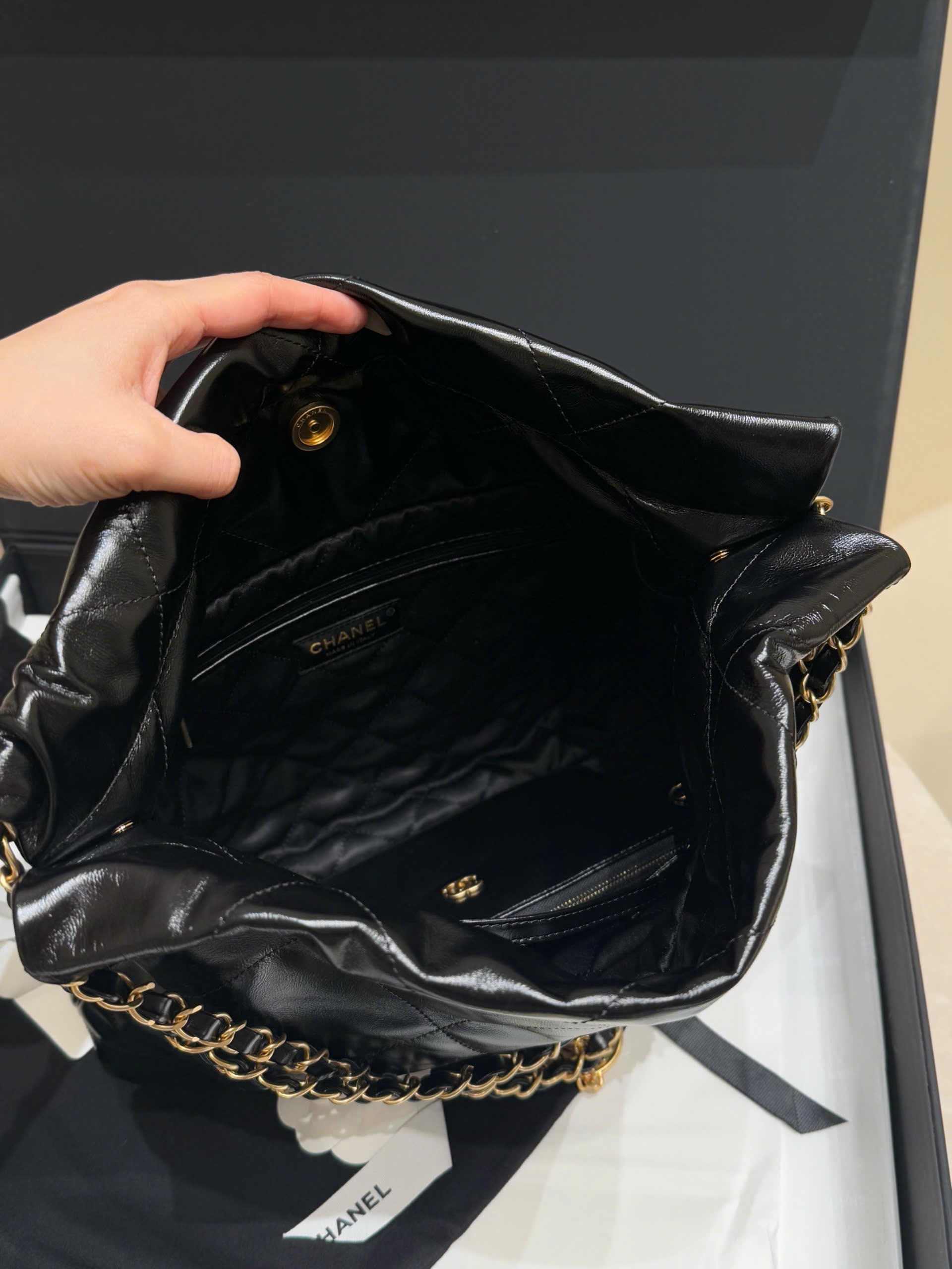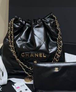 • Sản phẩm chính: Túi bucket đeo vai (kiểu dáng drawstring) bằng da đen bóng, thiết kế chần bông (quilted), logo CHANEL to bằng kim loại mạ vàng phía trước.