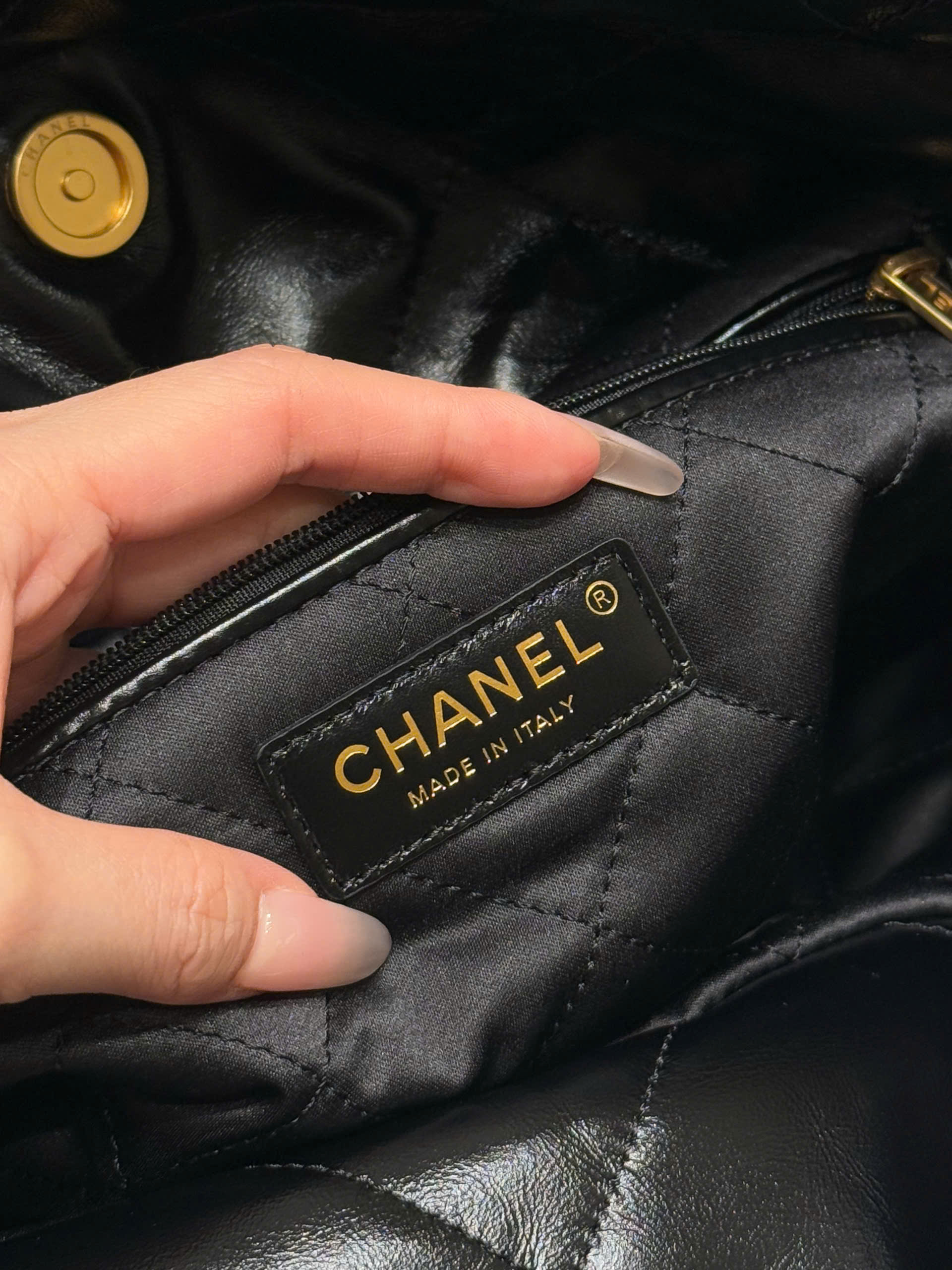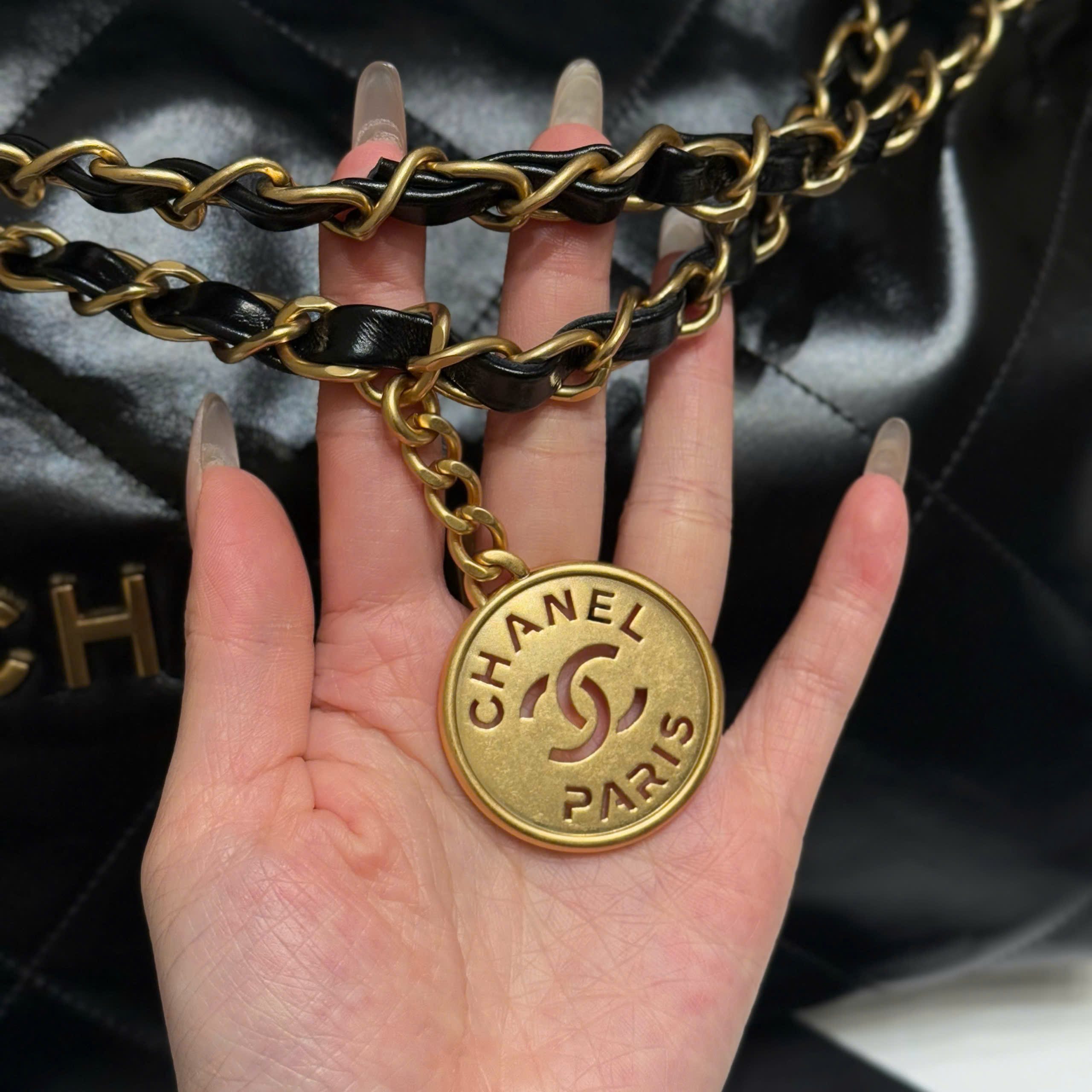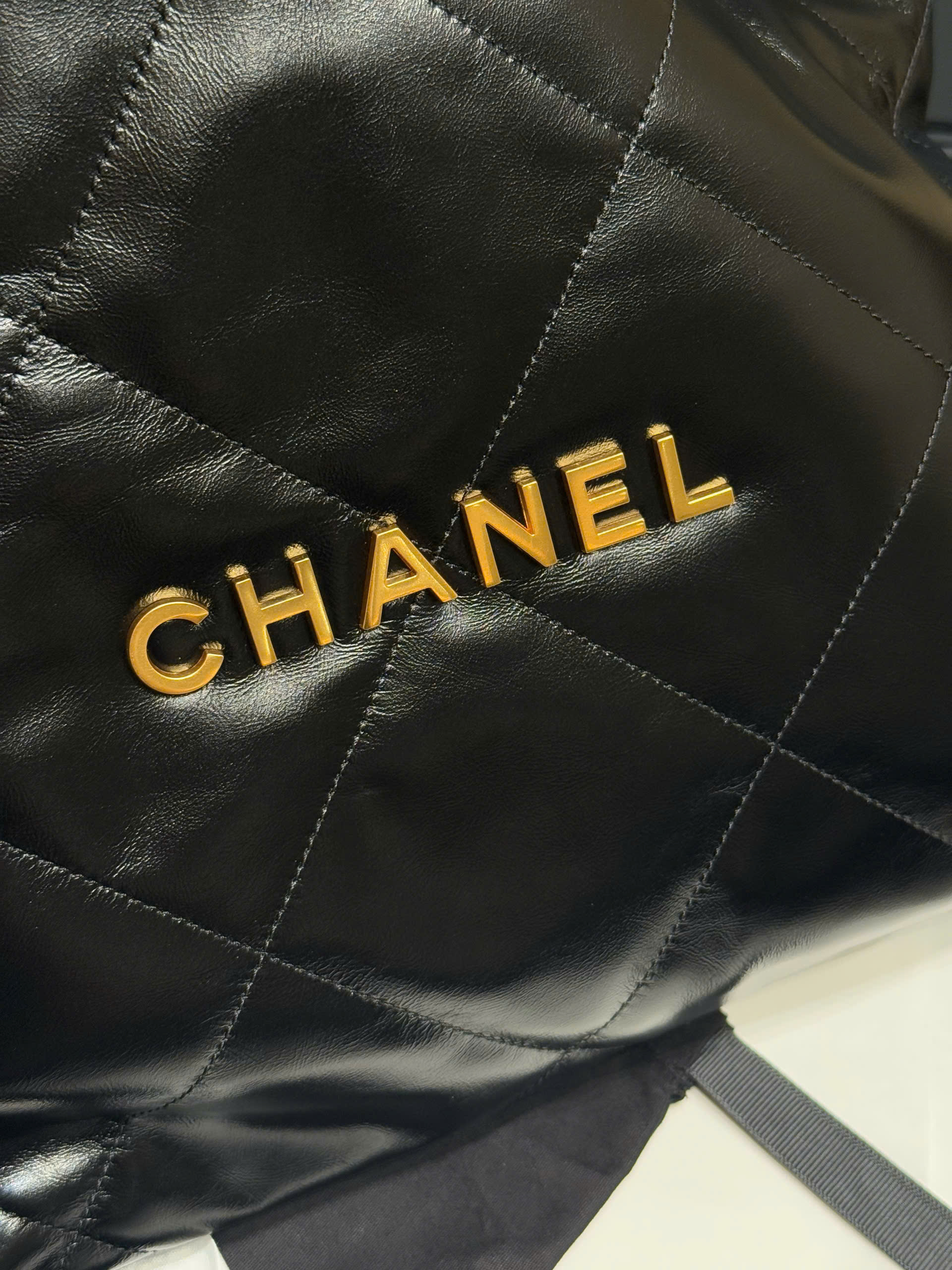 • Main product: Black leather drawstring shoulder bag, quilted design, large gold-plated metal CHANEL logo on the front.