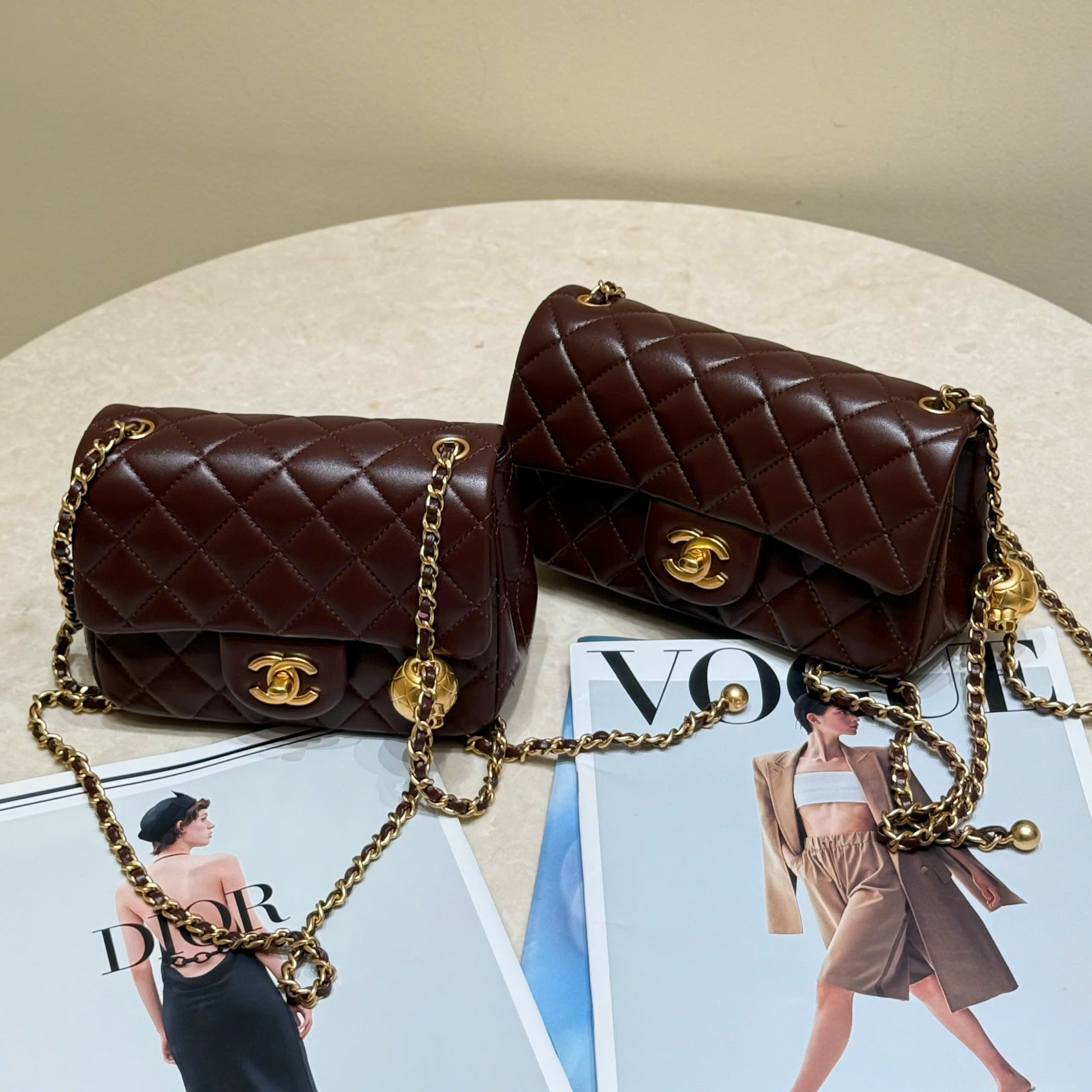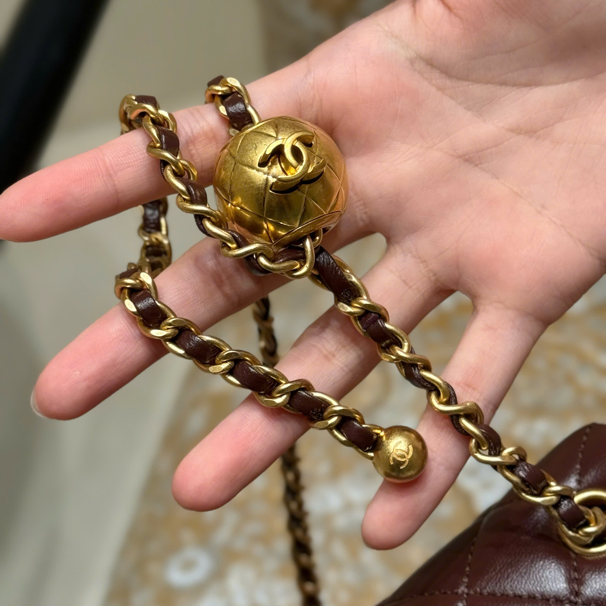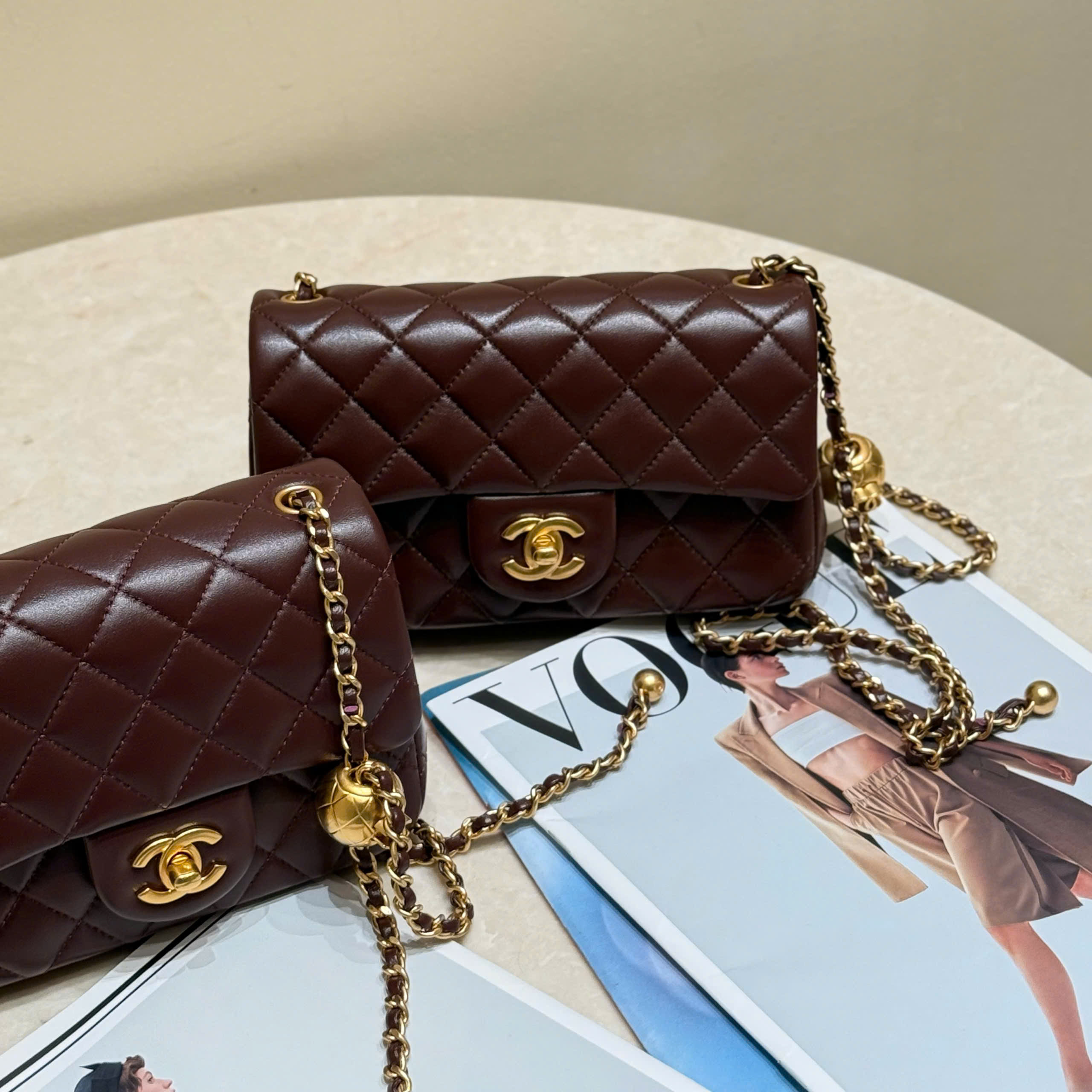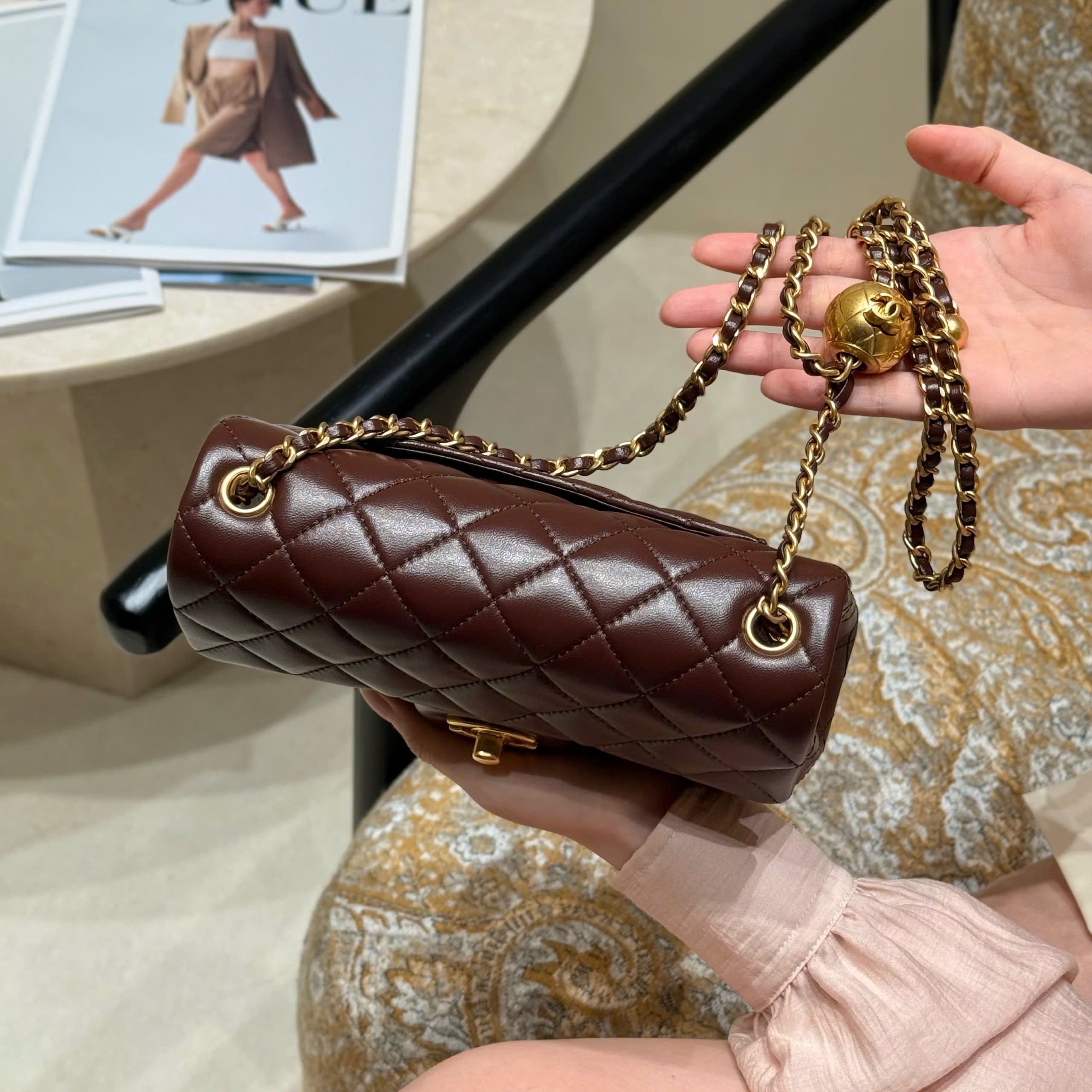 The classic flap bag, based on the classic style, now features adjustable gold balls for practicality