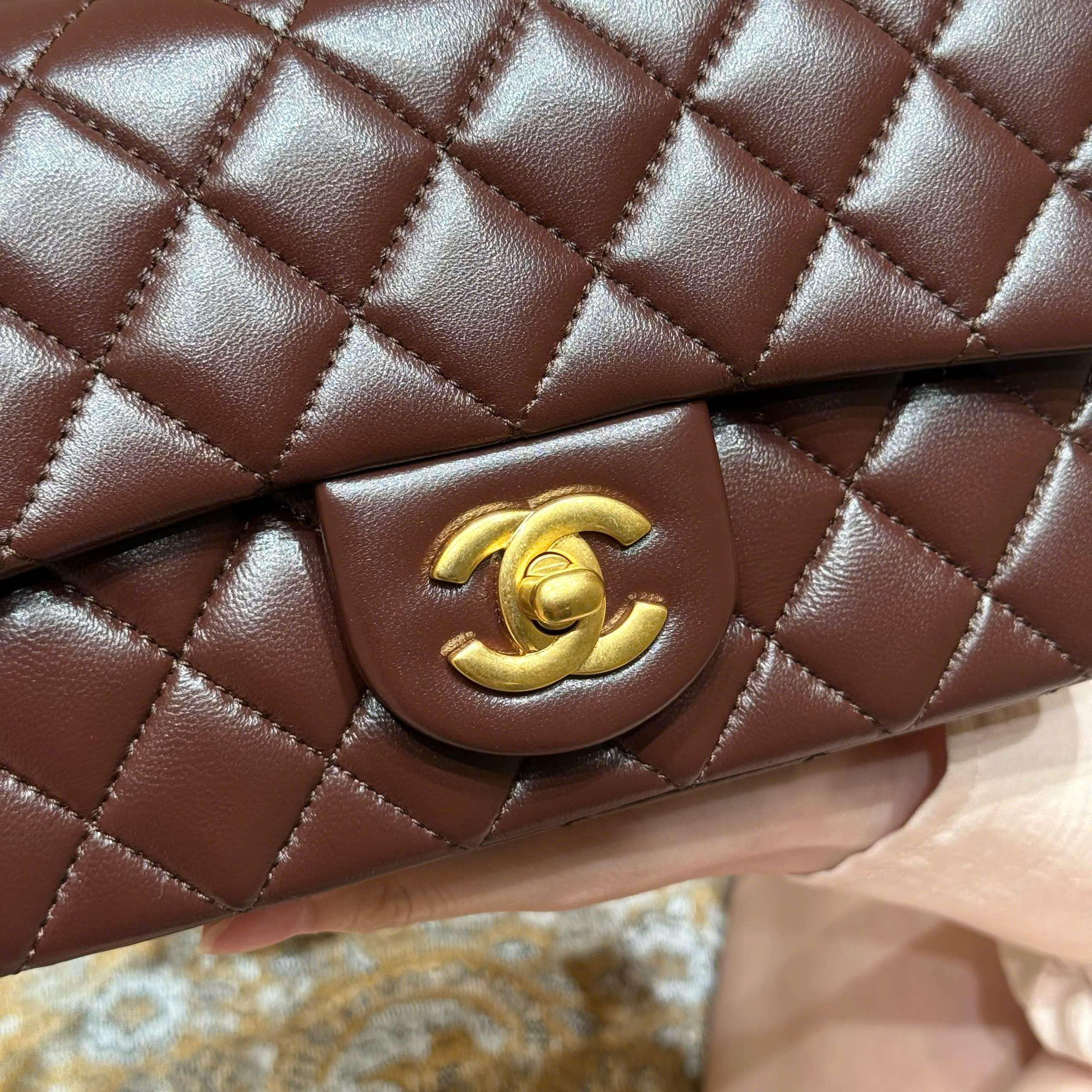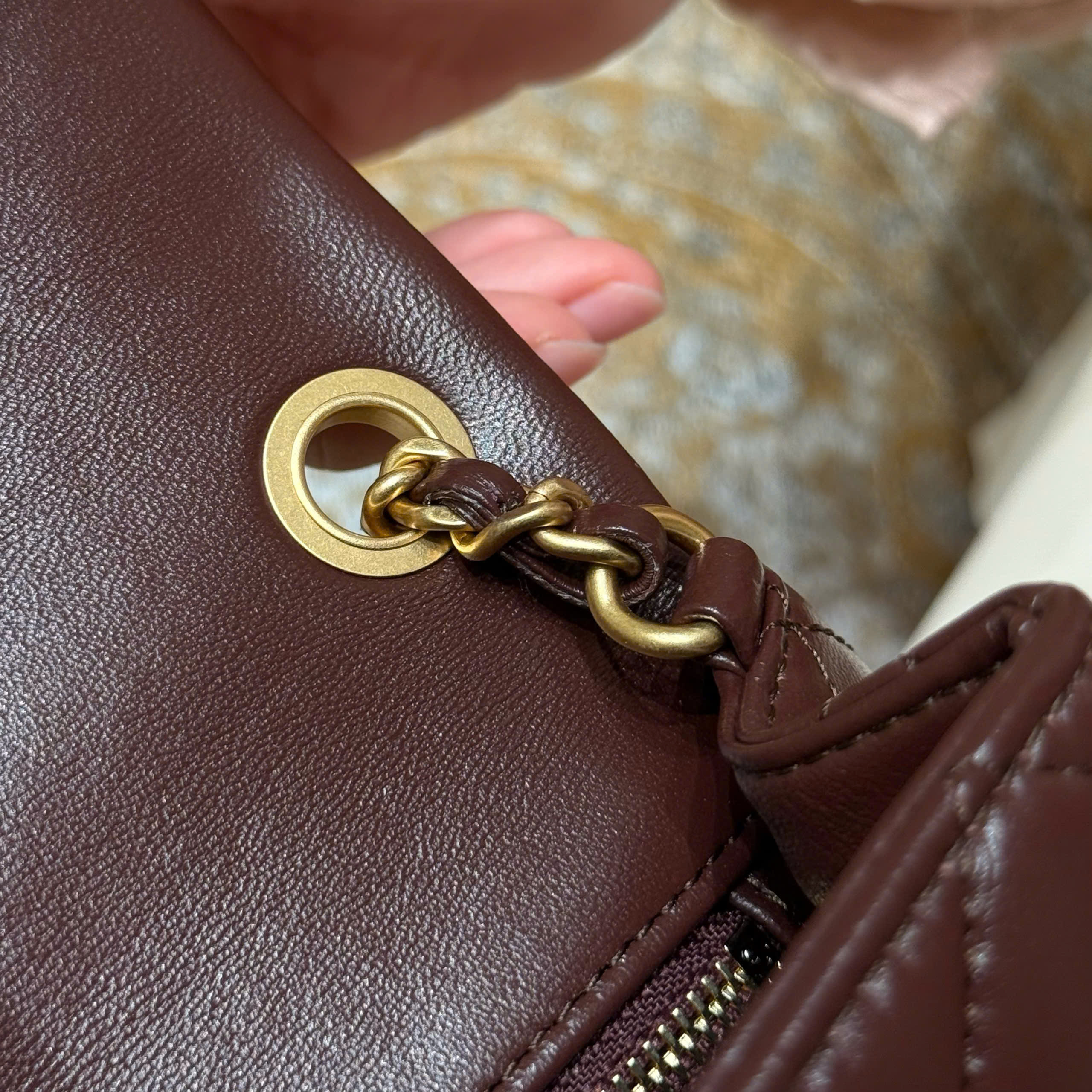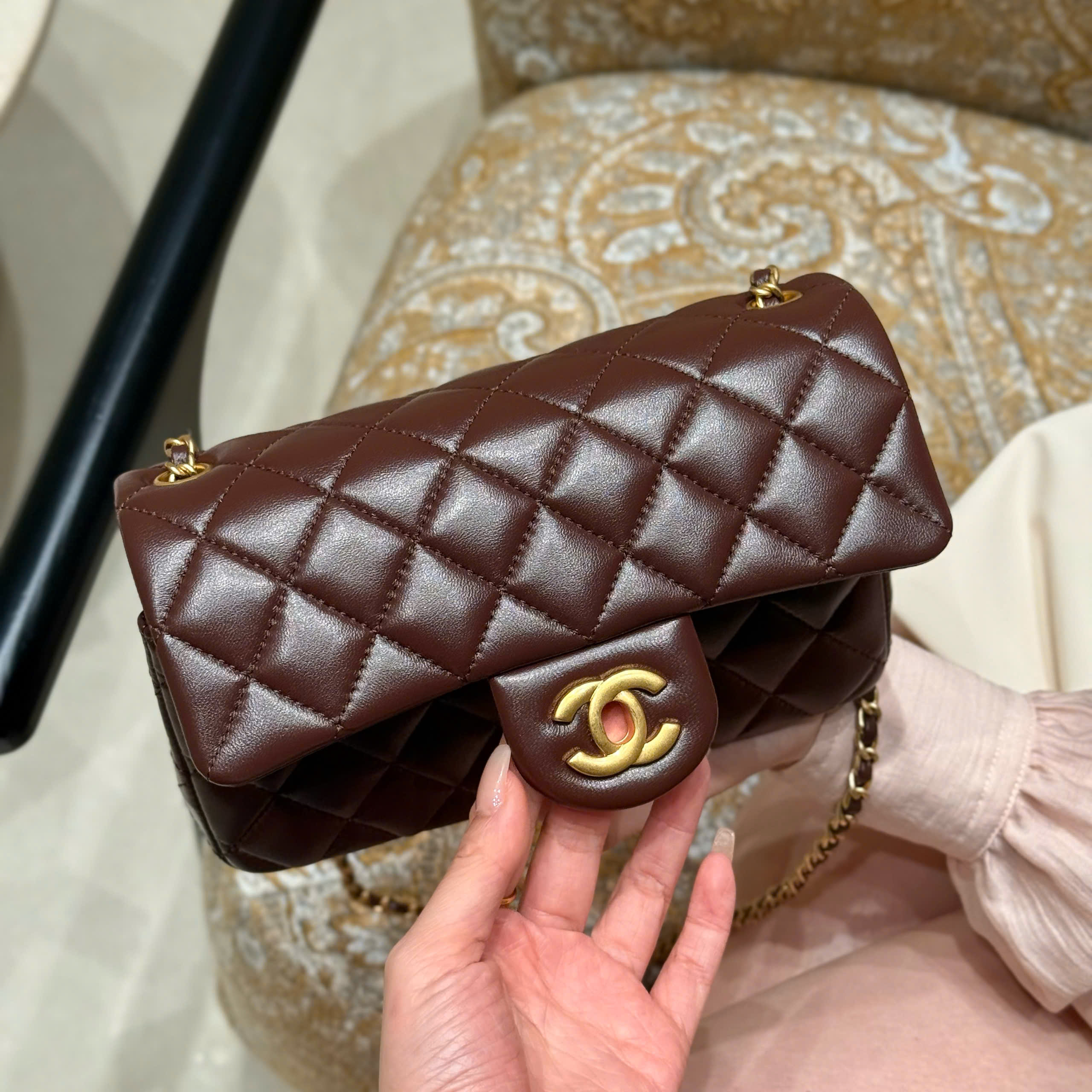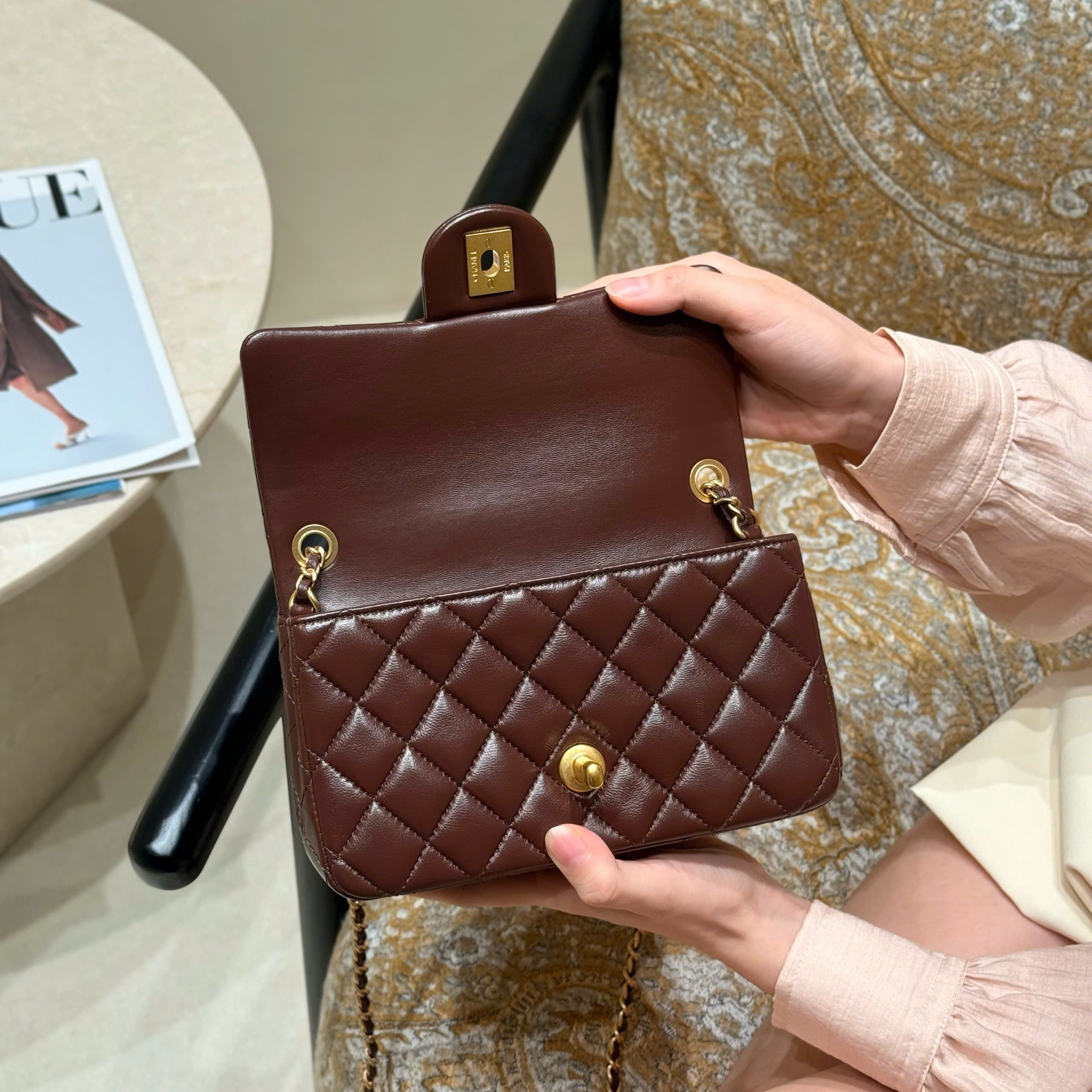 The classic flap bag, based on the classic style, now features adjustable gold balls for practicality