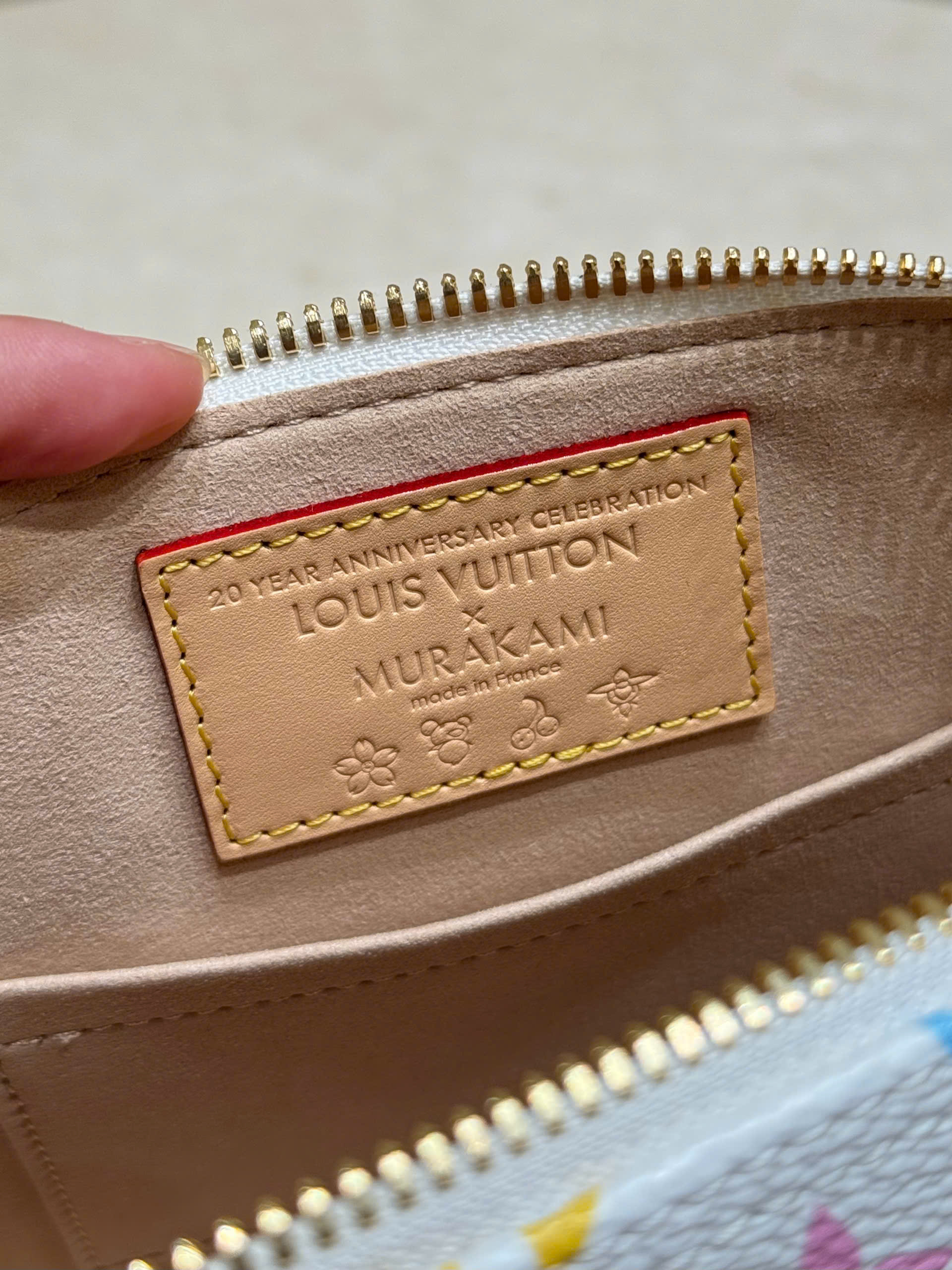 • Material: White coated canvas printed with LV logo and multi-colored monogram flowers (33 colors), combined with natural cowhide (vachetta leather).