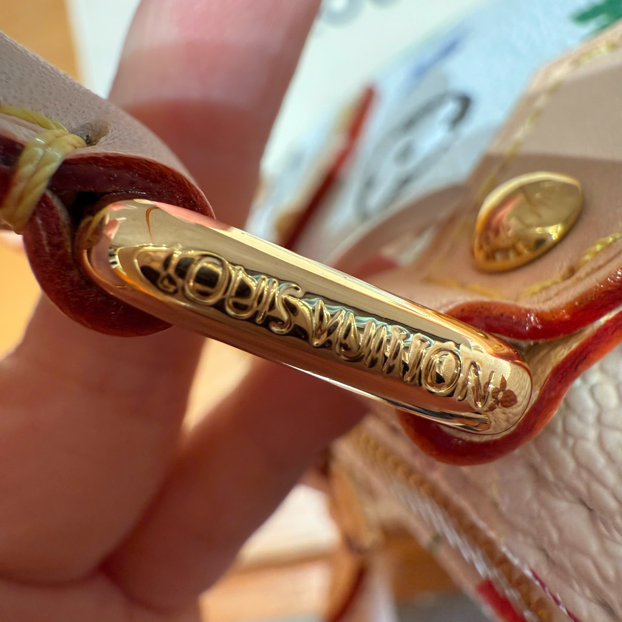 • Chất liệu: Canvas nền trắng in họa tiết monogram nhiều màu (33 màu khác nhau), viền và quai bằng da bò tự nhiên (vachetta leather).