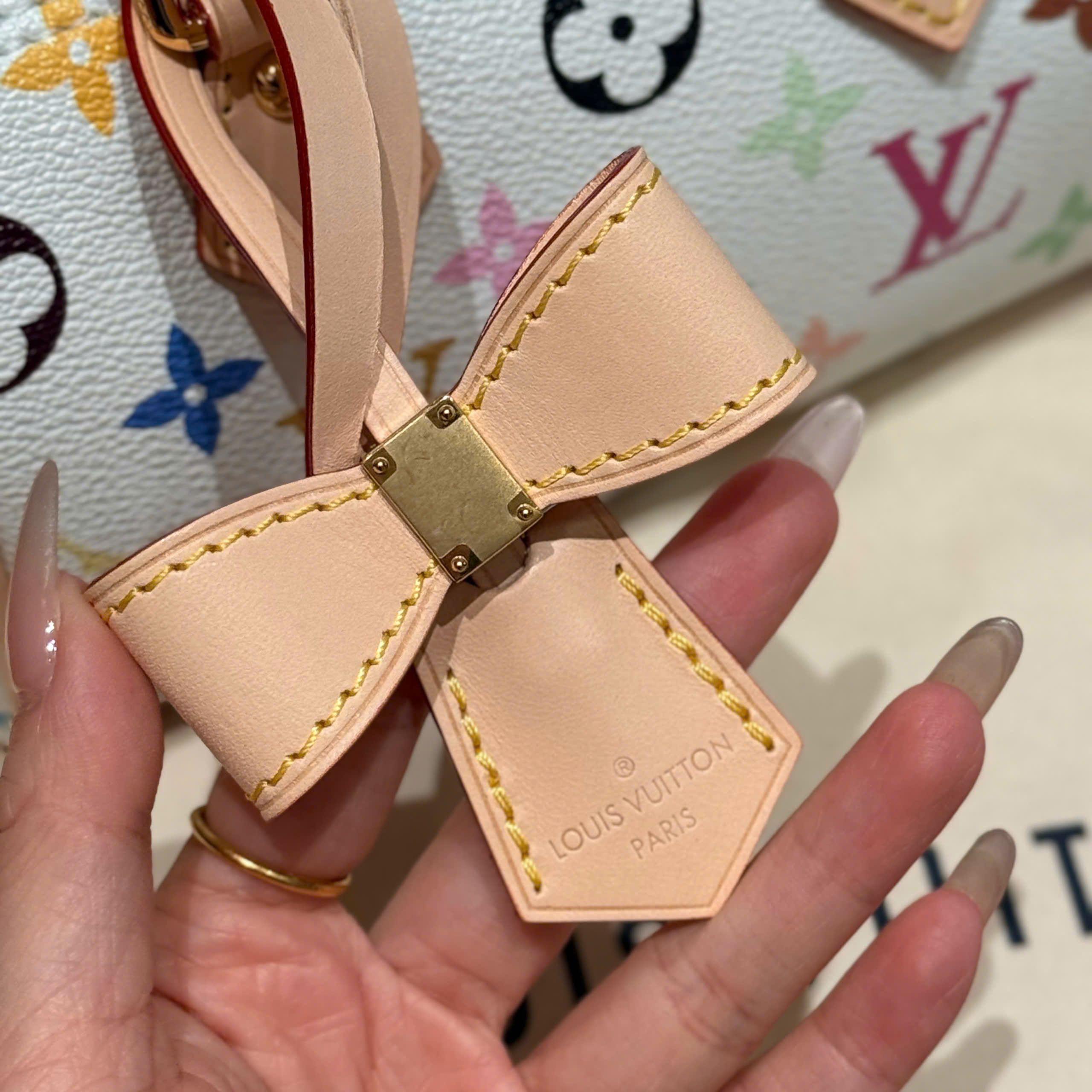 • Leather bow charm attached to the Louis Vuitton Paris tag (an additional decorative detail, usually not the default of the Multicolore Speedy line, can be an accessory).