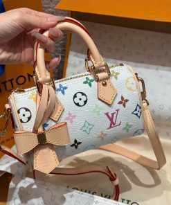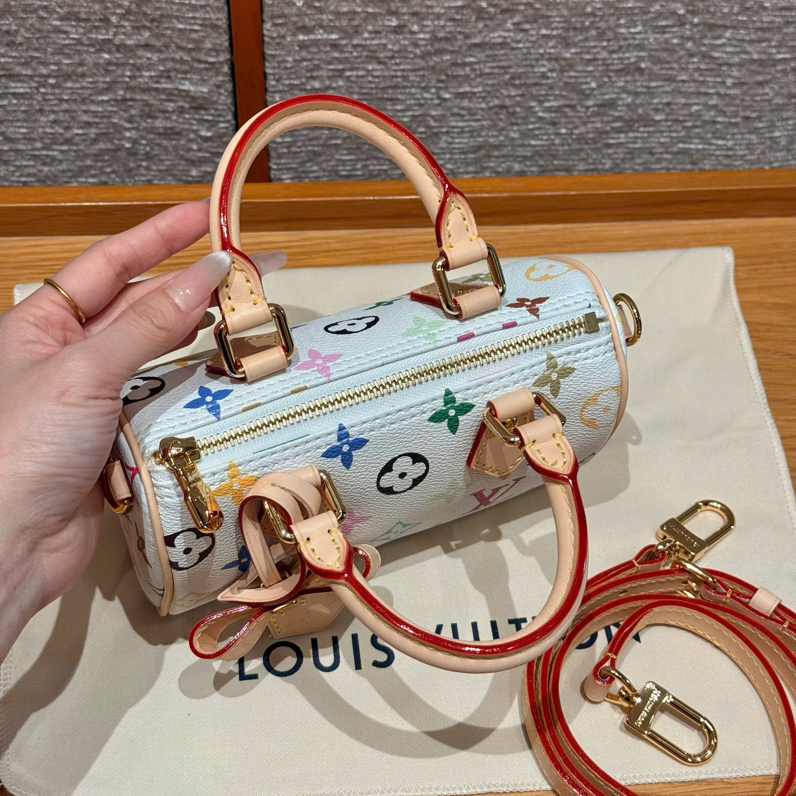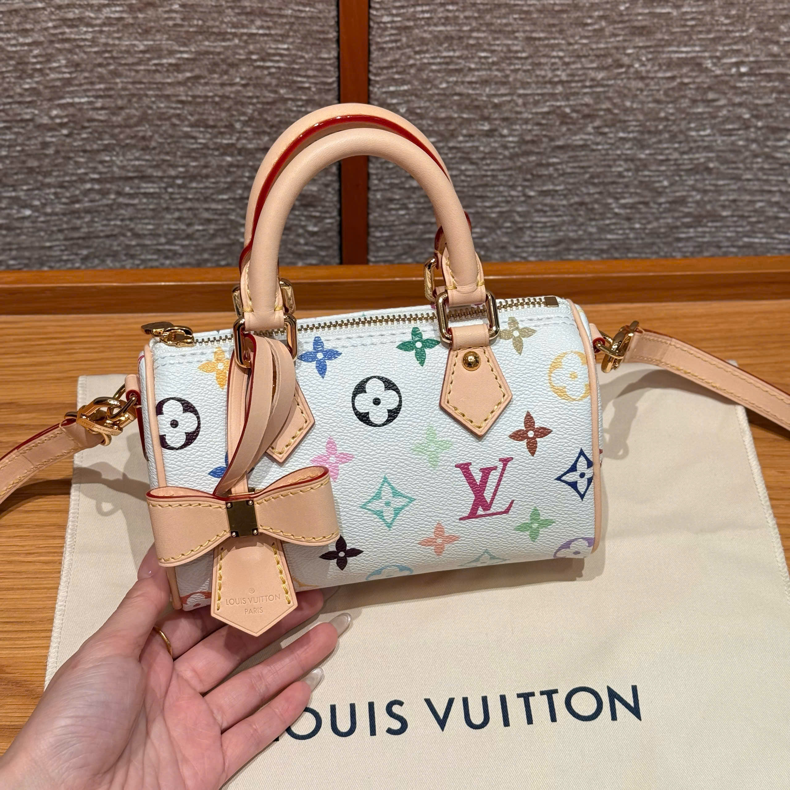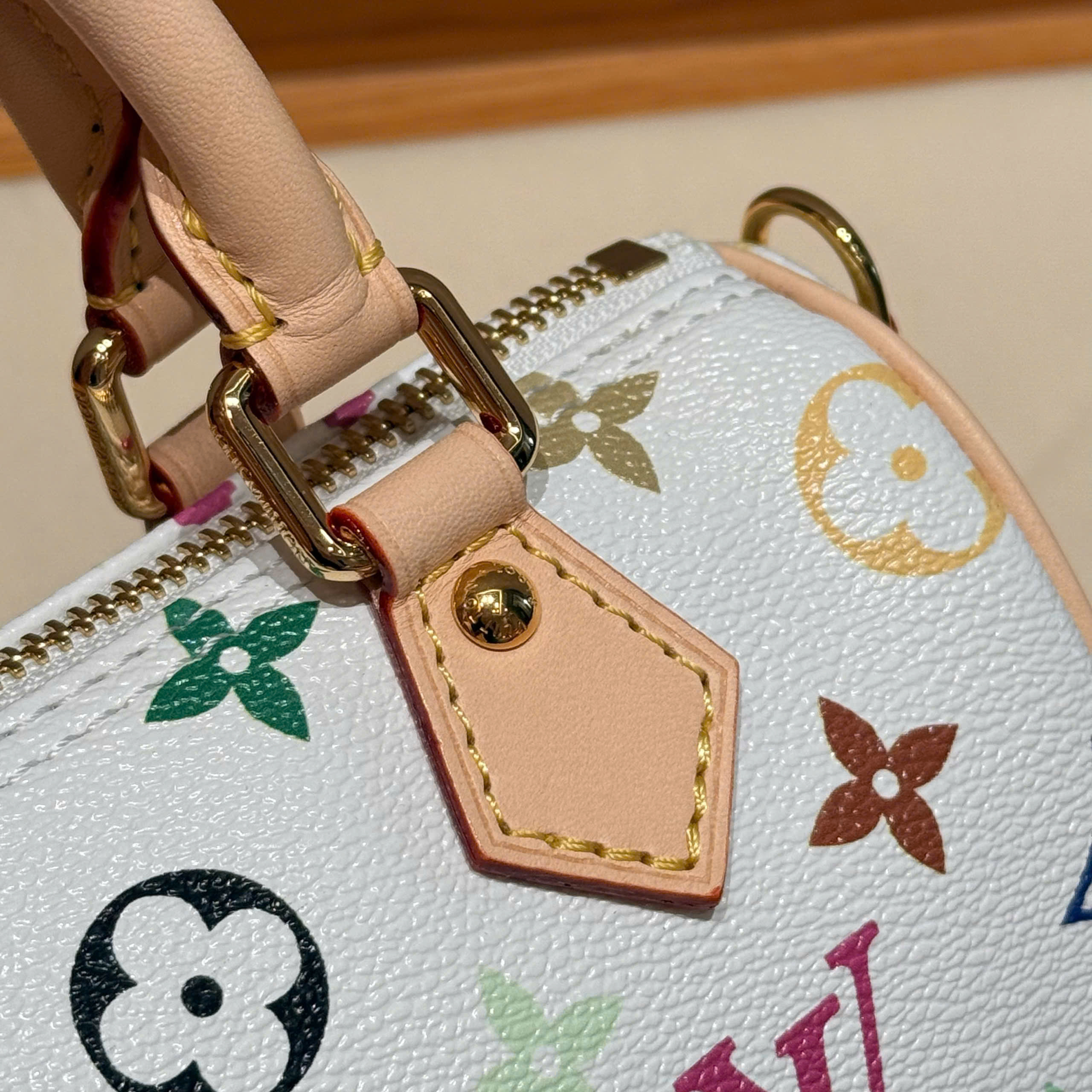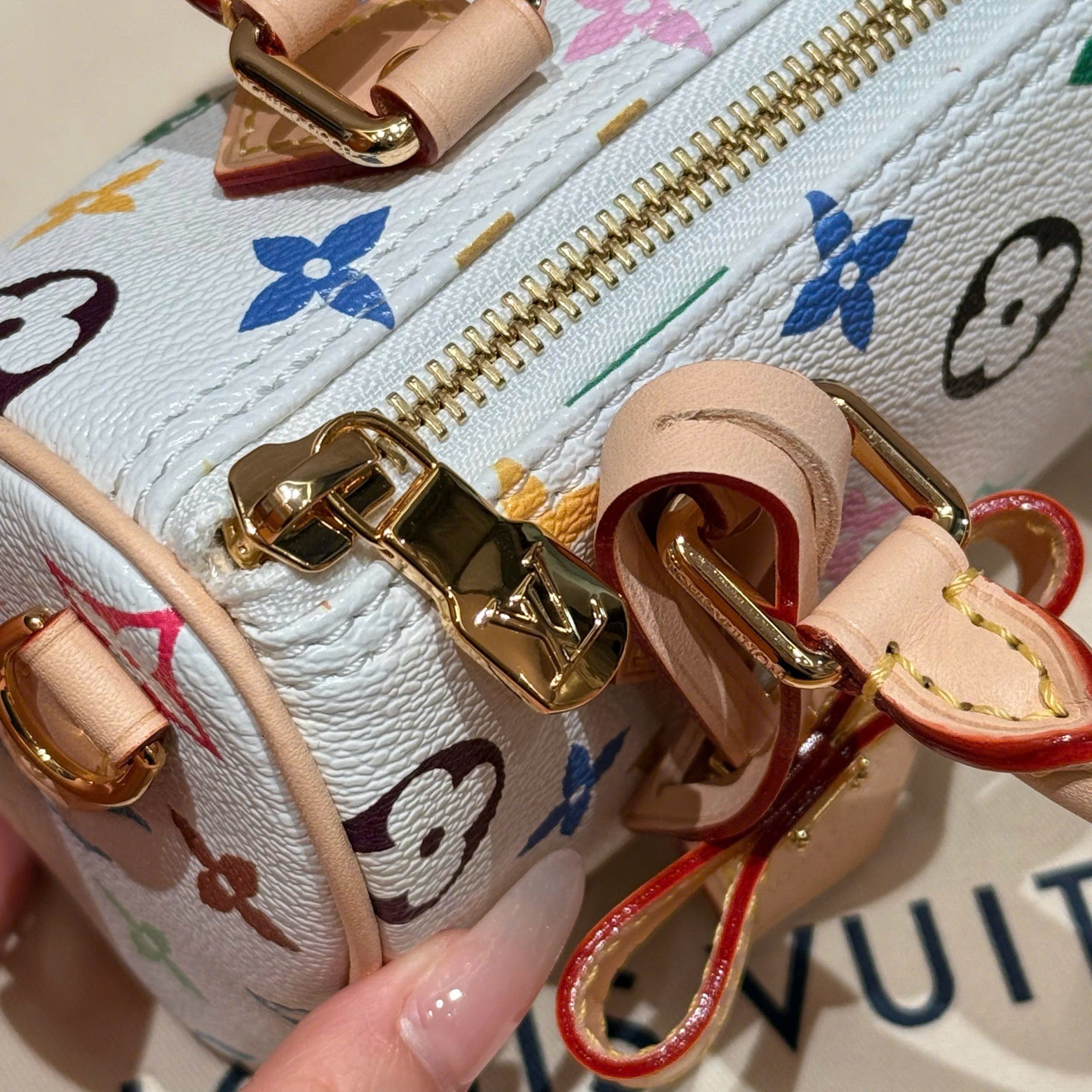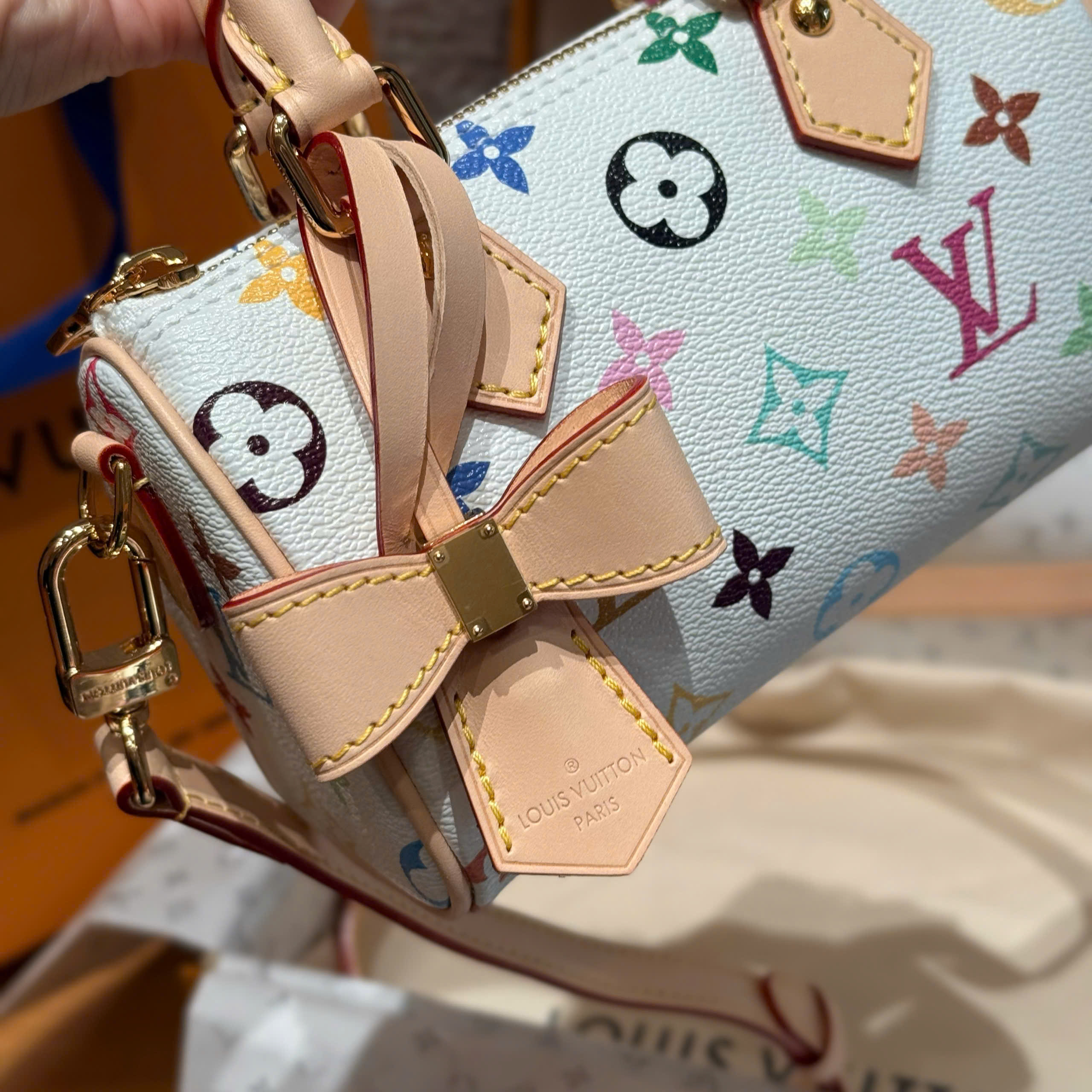 • Model: Louis Vuitton Speedy 25 (or Nano/BB depending on size) in Multicolore White. This is a miniature Speedy Boston Bag, with double handles and a detachable crossbody strap.