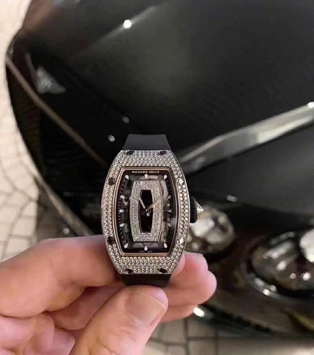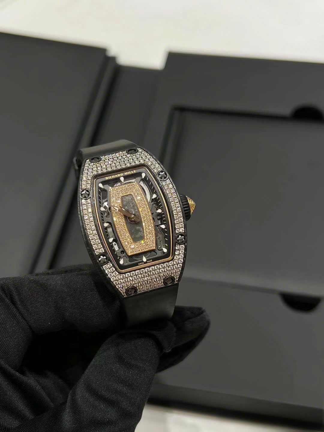 • Vỏ: màu đen, có vân carbon/ceramic, viền nạm đá lấp lánh (pavé setting).