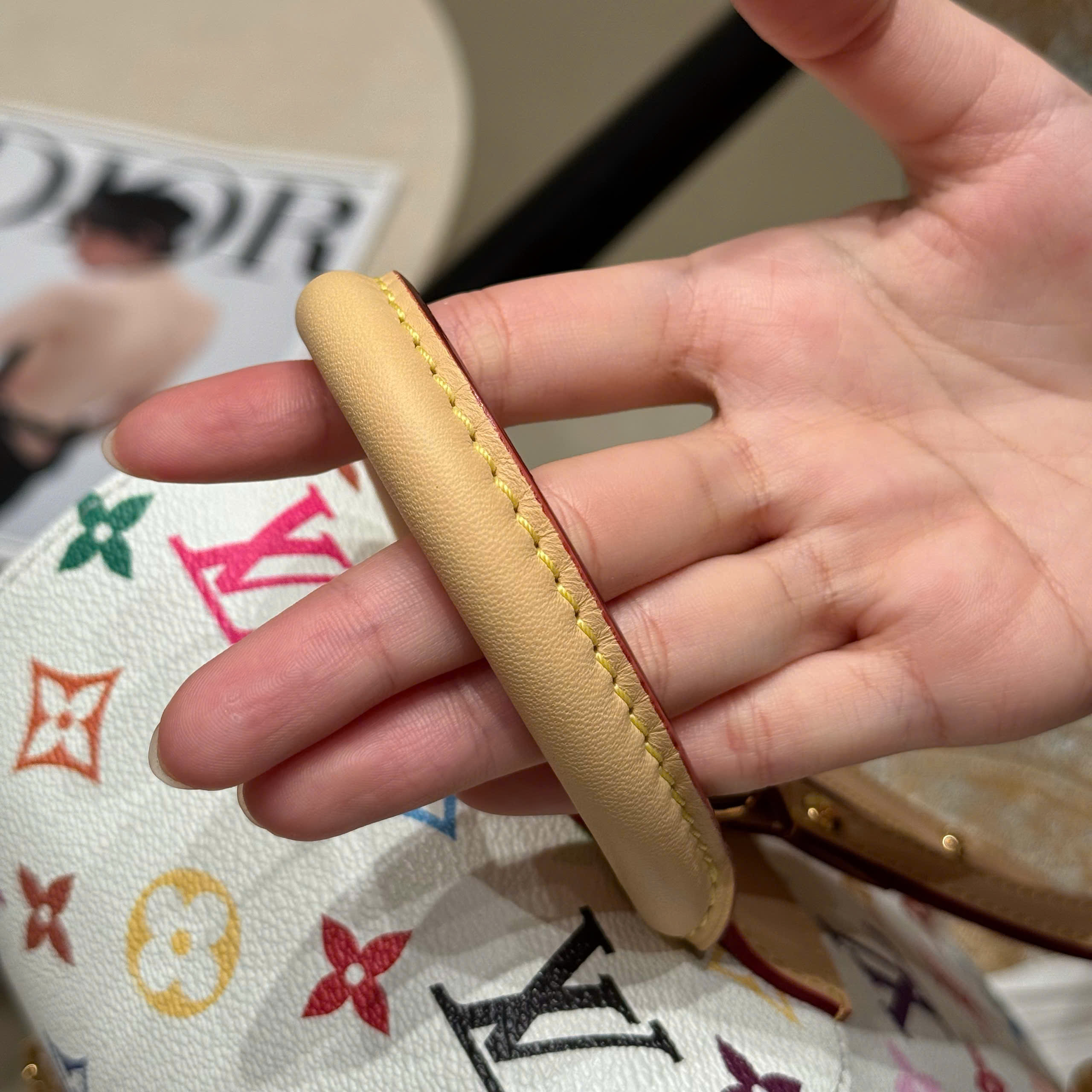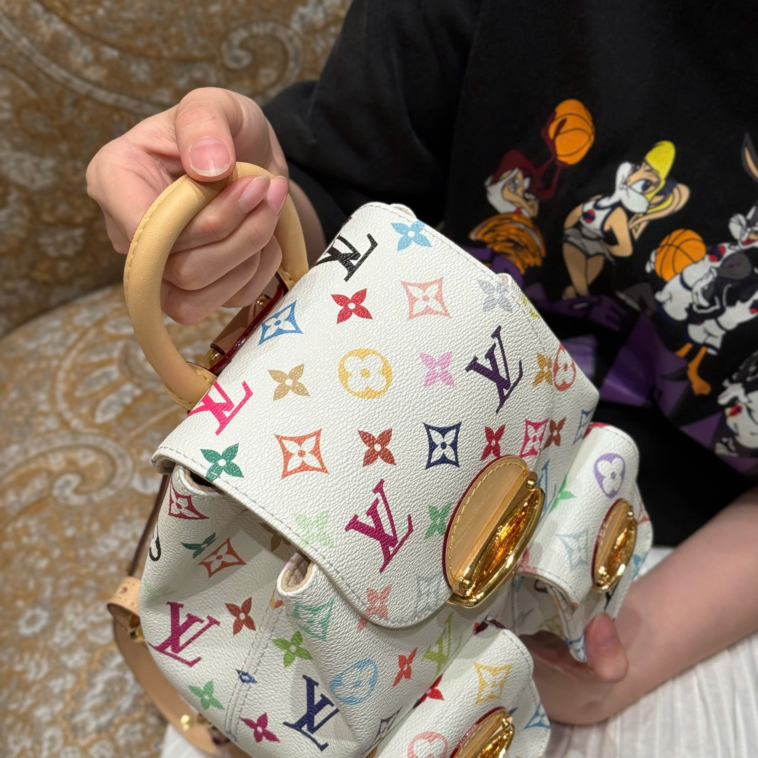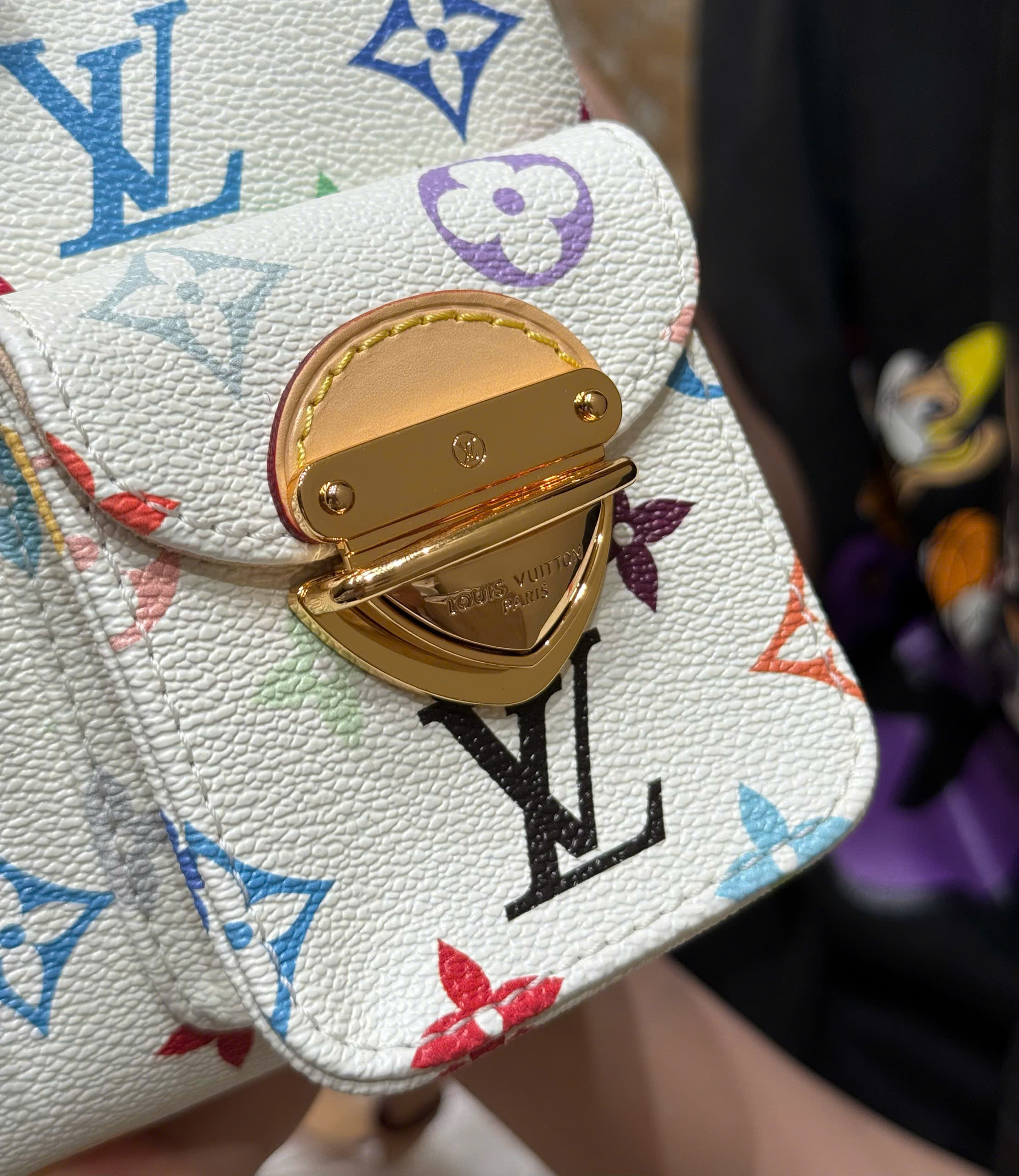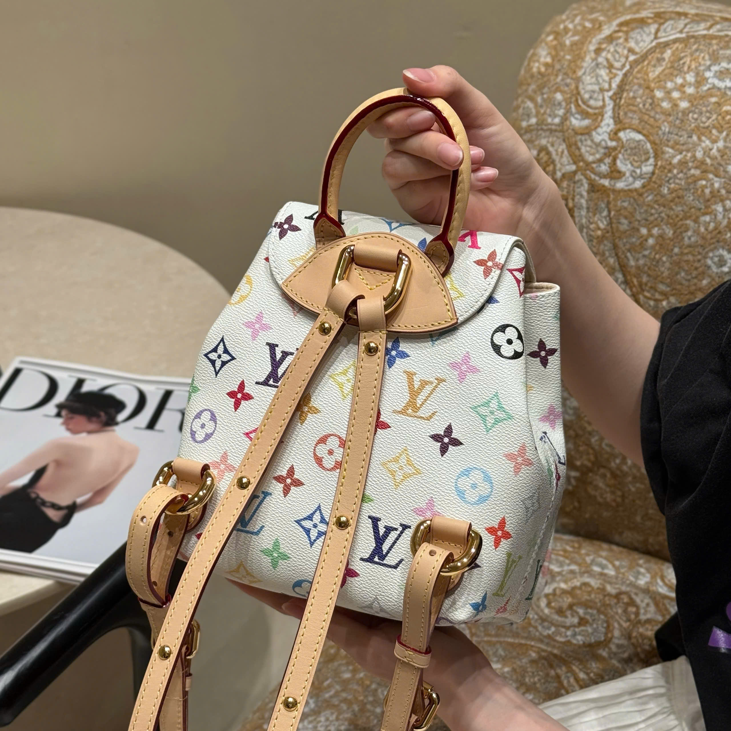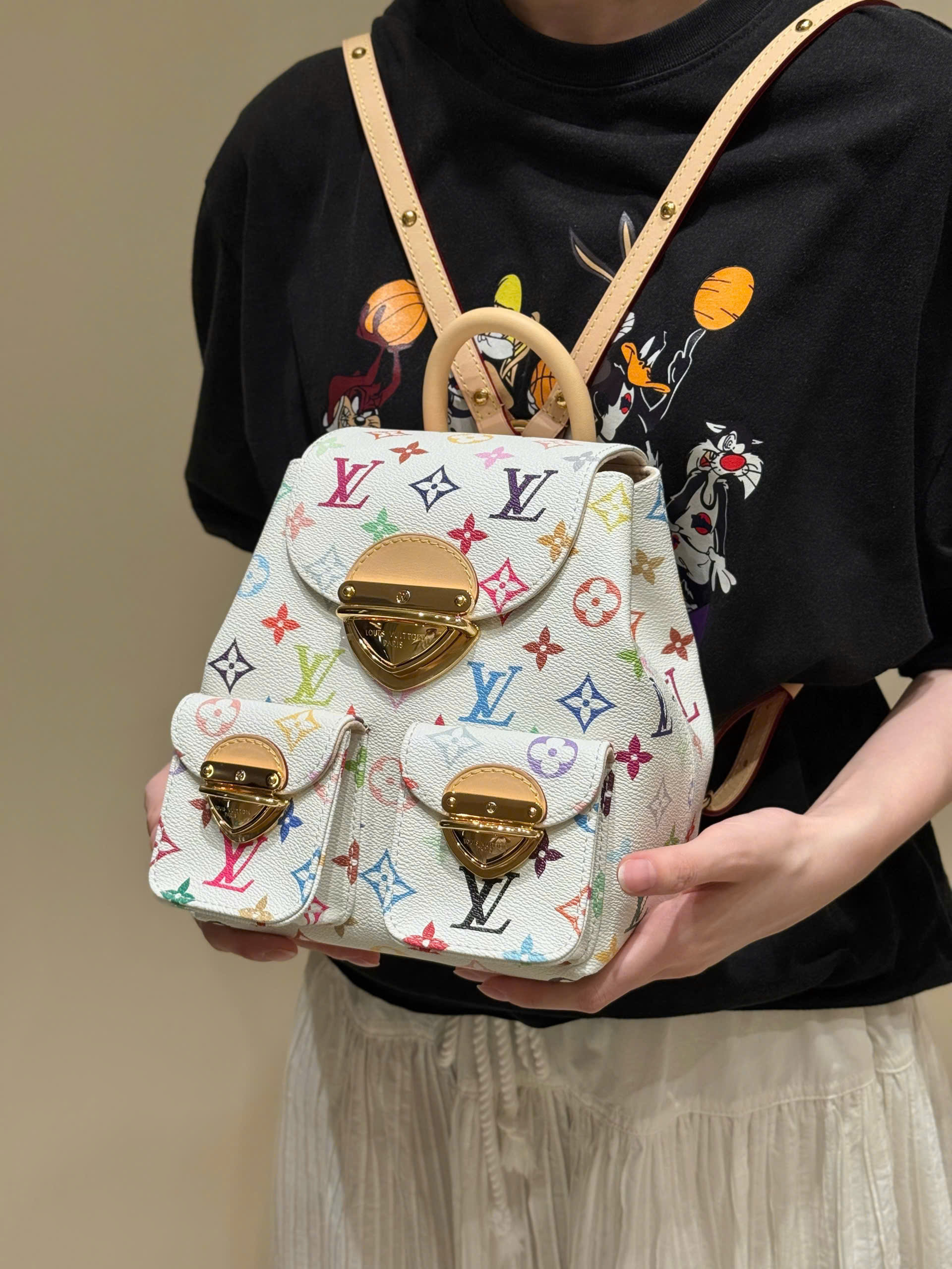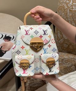 Balo Venice được làm từ vải canvas tráng phủ, nổi bật với họa tiết Monogram với tông màu rực rỡ lấy cảm hứng từ nghệ sĩ Nhật Bản Takashi Murakami, thể hiện tinh thần sống động của bộ sưu tập tái bản x Murakami. Chất liệu da bò cổ điển tạo nên quai đeo vai thanh mảnh, trong khi khóa lớn tạo điểm nhấn ánh kim cho nắp và túi bên ngoài.